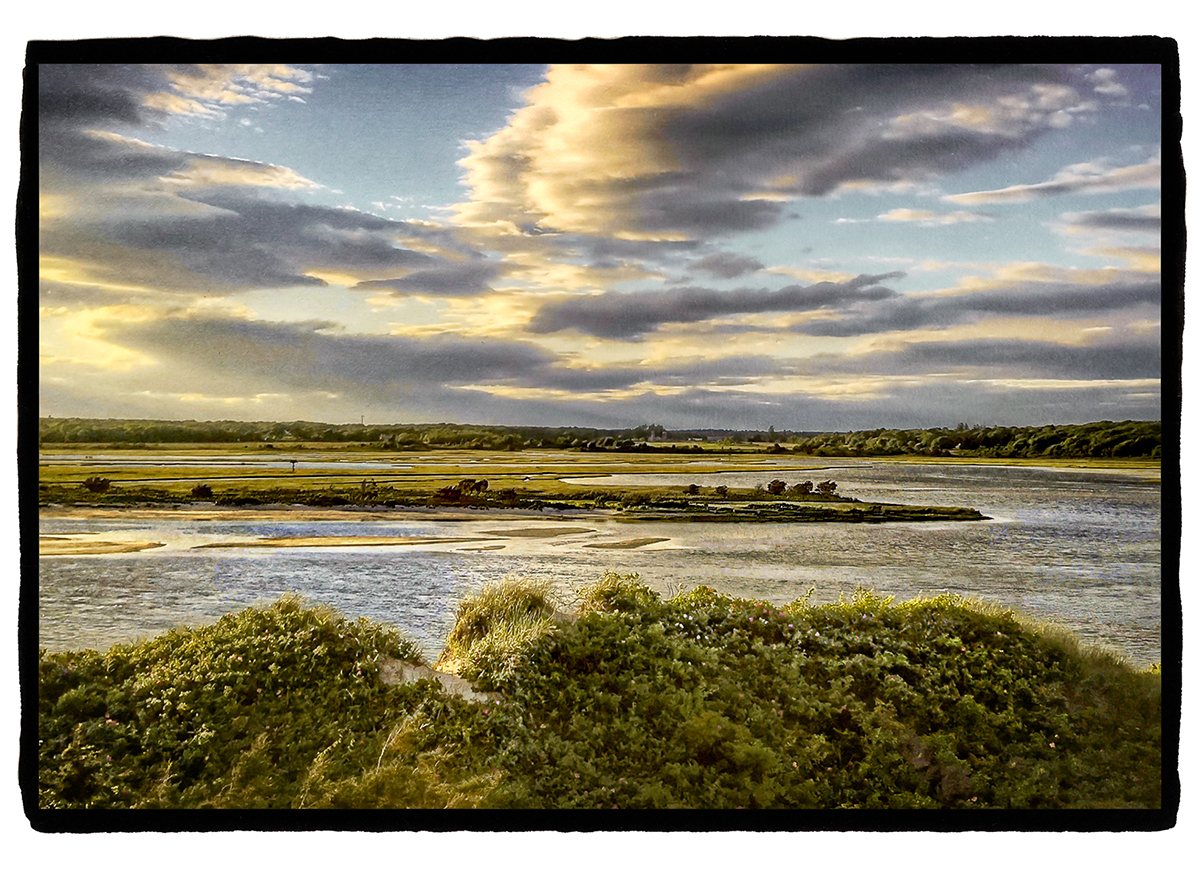 Several years ago, I climbed up a ladder in the Art Room of the New Bedford Public Library so I could peer down at the restoration in progress of Alfred Bierstadt’s massive painting Mount Sir Donald. It was impressive, but what stole my heart that day was a small painting on the far wall by another New Bedford painter, Charles Henry Gifford. Sunlight from a large side window made Coastal Scene with a Gundalow glow with an ethereal quality. I was captivated by the play of light on the surface and inspired by these New Bedford artists to find my own way to convey the timeless and luminous quality of the landscape that is my home. Looking beyond the imprint of the modern world on the Southcoast landscape, I began to imagine what these painters might have seen.