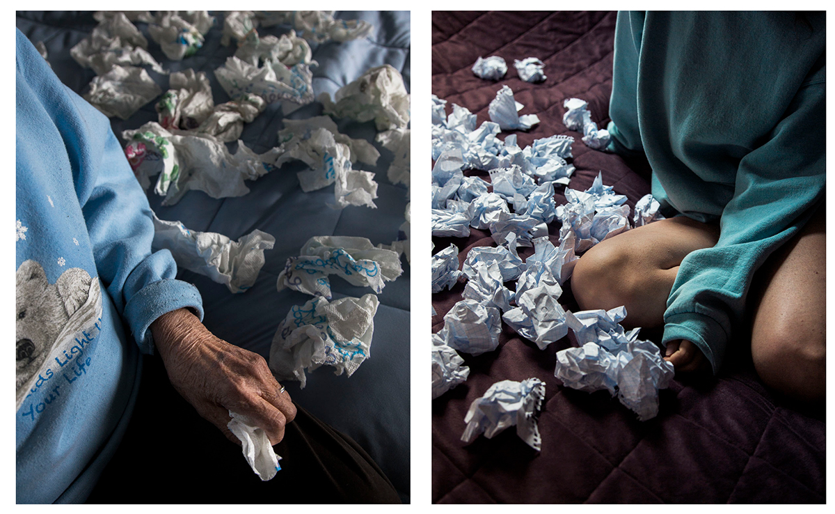 My photographs explore the physical and emotional space I find myself in while living with my 91 year old sightless grandmother. Sixty years apart, we are paralleled by the residue of our experiences, mine emotional, hers physical. We act as a refuge for one another, a temporary sanctuary in the world that lies beyond our home. While living with her, I received a letter in the mail indicative of the life I’ve left behind, a letter that challenges and disrupts this sanctuary. I am caught between the past and the future: as I rebuild my life, my grandmother is a glimpse into my own future, which is genetically inevitable. These photographs represent the acceptance of these challenges, the beauty of our relationship, while always keeping in mind the temporal nature in which we exist.