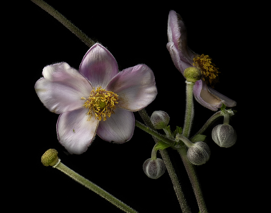 The narrative begins in total darkness as I accentuate and embellish the flower form with fast-moving, strategically positioned hand-held lights. Each floral portrait is a combination of many digital negatives. My “canvas” begins with a layer of the darkest darks. Then, in the style of a Renaissance painter, I gradually paint in the light that reveals the form, detail, and ephemeral grace hidden within.