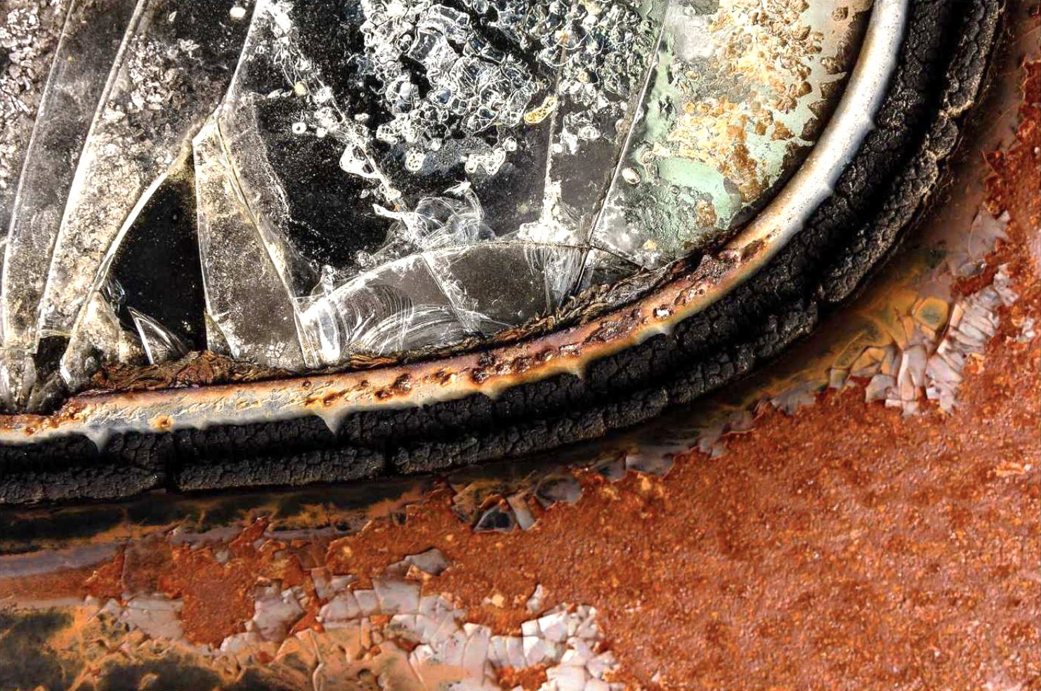 We truly learn a lesson about taking pause when we look at Jan Ekin’s photographs. Textural topographies made up of complex and countless surfaces consume our entire view. We find ourselves marveling at peeling paint chips, spidery cracks on glass, and grainy slivers of rubber, wanting to take a step back to see more yet feeling that these things might be a little bit less marvelous if we did. These painterly glimpses are treasures, in a pretty literal sense.