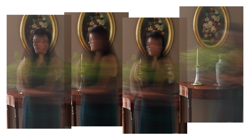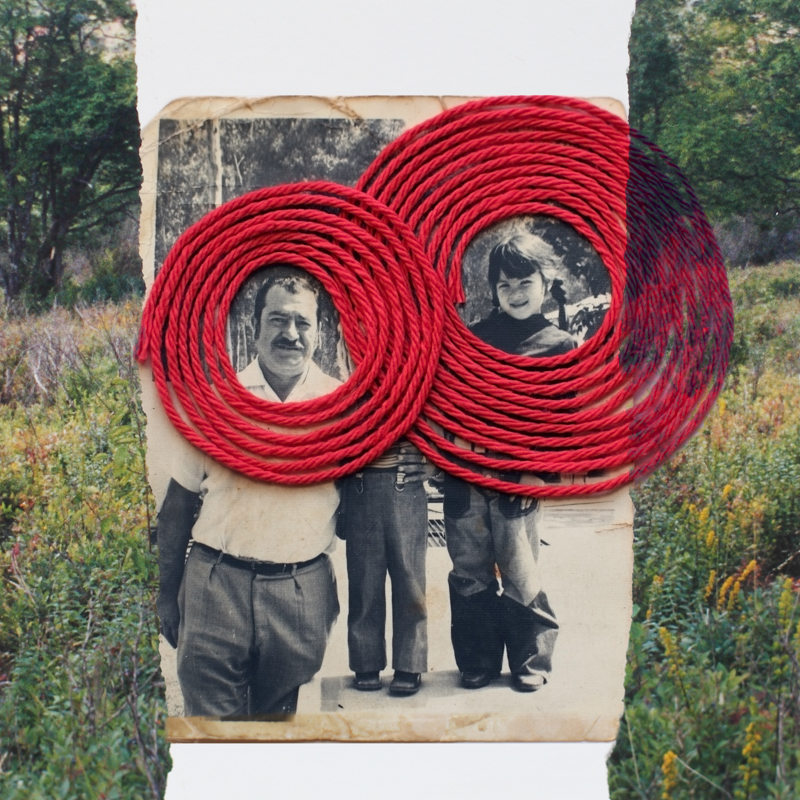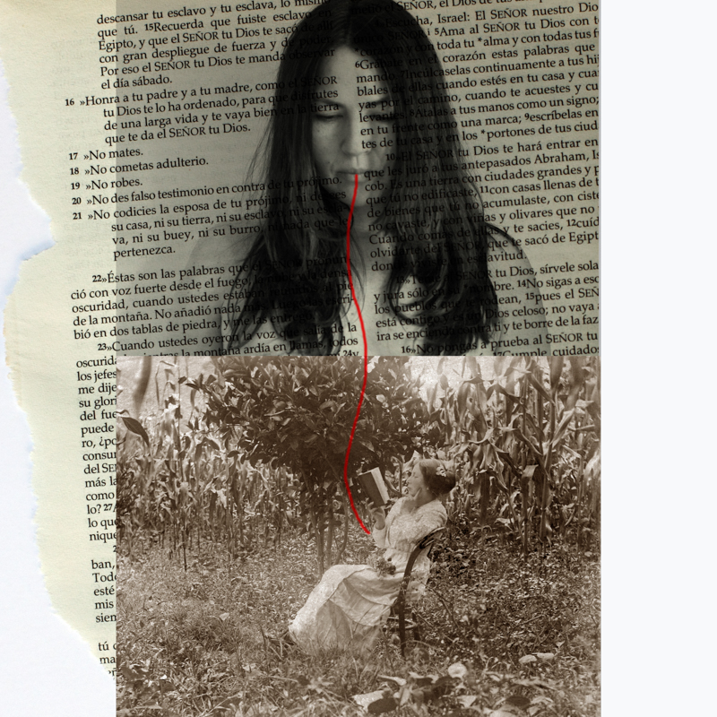 In my series, Historias fragmentadas, I create digital compositions that unsettle the images of the past in a way that allows me to look through the cracks. By tearing, juxtaposing and layering archival documents, fragments from my journals, and objects from my childhood, I have shed light on a personal story within an ancestral story that spans generations. Continuing the quest to re-merge with what I have lost, I use staged imagery, mostly self-portraits, to transport my physical presence into the spiritual past as seen in the compositions. – Claudia Ruiz Gustafson