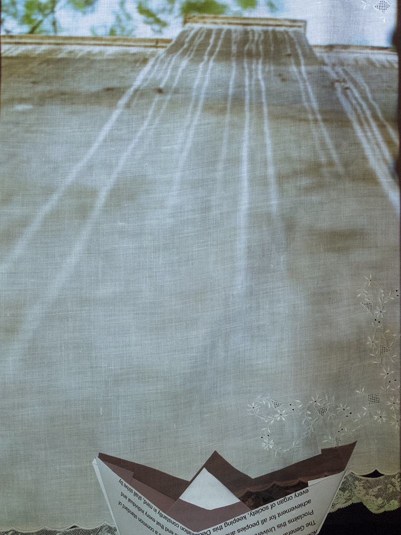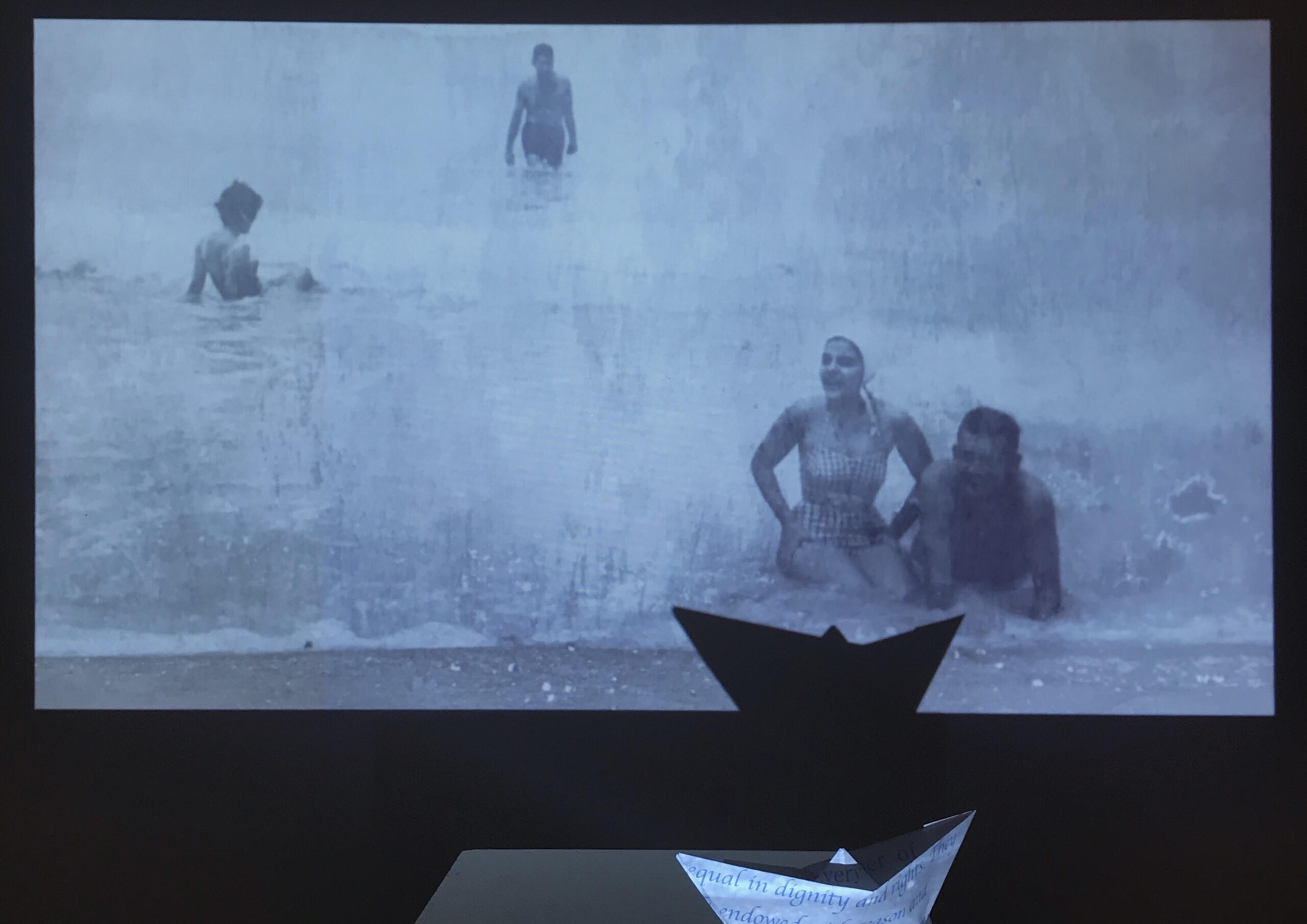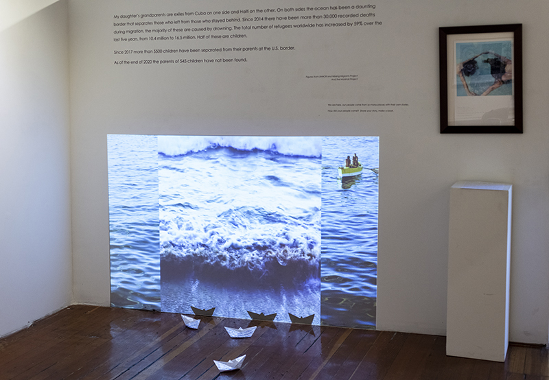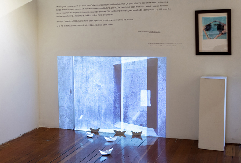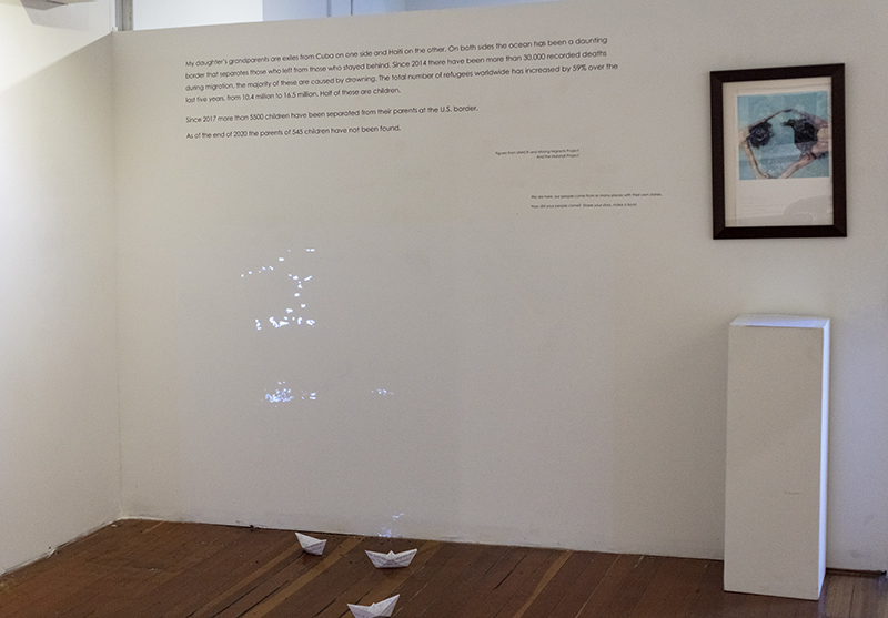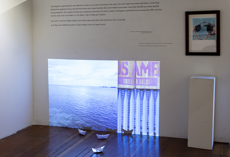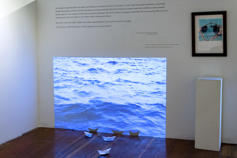 This installation combines shifting images of borders with barquitos de papel, paper boats, folded from paper printed with the Universal Declaration of Human Rights and the Declaration of the Rights of the Child, adopted by the international community in 1989 and ratified by 196 countries (not including the United States). In this country, Immigration has always been a fraught issue. But immigration is not only an American issue; it is a human issue that impacts people across the globe in ways that can be lifesaving or devastating.