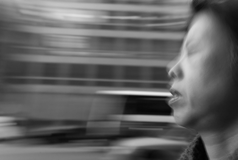 Most of my subjects are ordinary humans with ordinary features that have tremendous momentum as they go from point A to point B. I am interested in exploring what they are feeling and who they are as they flow between those points. Although all have their public faces, it is the tiny insignificant details that reveal the person in front of and behind the lens. In a way, I think of this series, Momentum, as self-portraits. I try abstracting the rest of the world flowing in the opposite direction, purely with the motion of the camera. Sometimes it works.