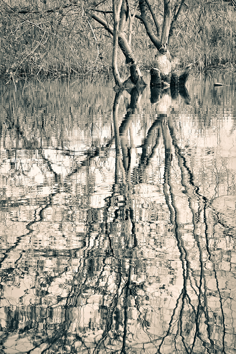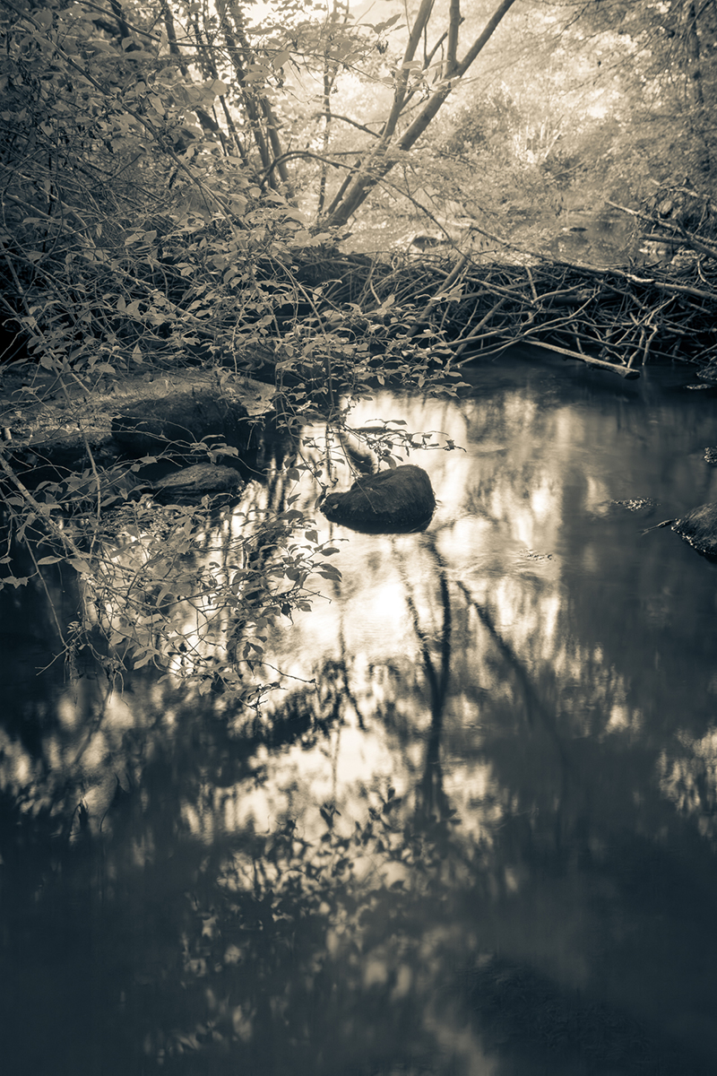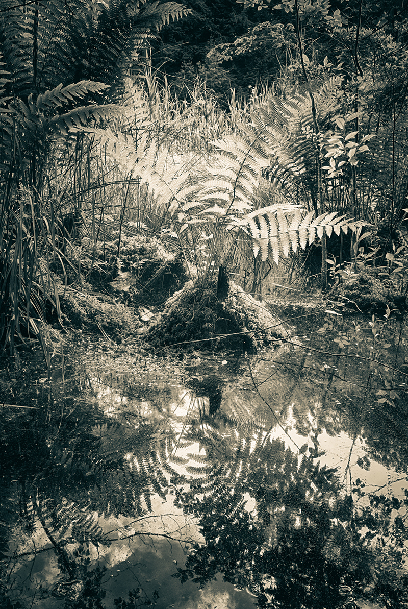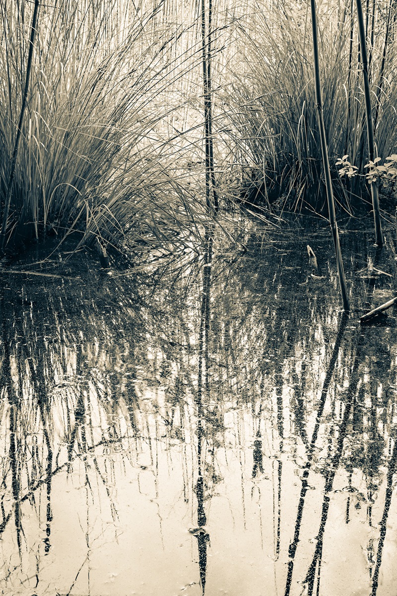I’ve been fascinated by beaver bogs for a long time, in part because they are far off the beaten path. The surrounding forests were clear cut for fuel and farming almost 200 years ago, but because they are waterlogged, these bogs have changed little since they were first dammed up by beavers, hundreds or even thousands of years ago, but are now in danger of drying up. These creatures are responsible for a continuous turnover of trees and plants in a uniquely rich environment that supports themselves and other animals. Beavers have notoriously poor eyesight, and are thought to perceive only blue and yellow. My muted, duo-toned images imitate the beaver’s unique vision and are printed on the thinnest translucent Japanese gampi tissue to reflect the fragile, precious, and threatened bog environment. The prints are backed with metallic leaf, so that the light diffuses through the delicate paper, mirroring the silver light that I experienced in beaver bogs on many early mornings.